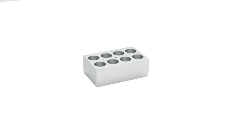 Bloque metálico para 8 tubos de 50 ml (Ø agujero 29.8 mm profundidad 48 mm).