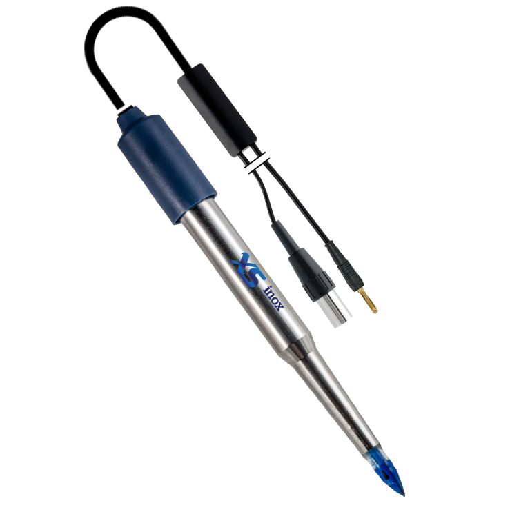Electrodo de pH XS 2 PORE STEEL T DIN diámetro Ø 6 mm L= 120 mm rango pH 0…14 temp. 0…+60 °C cuerpo INOX 316. Electrolito polímero. Con sensor de temperatura NTC30K integrado. DIN + banana 4 mm. Para penetración en alimentos.