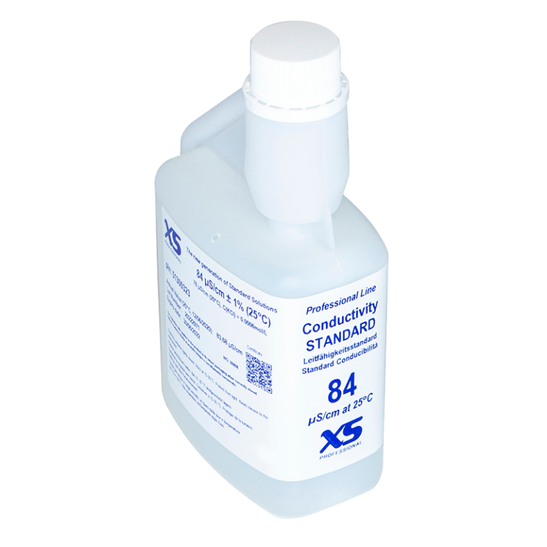 Disolución patrón de conductividad XS 84 µS/cm a 25ºC ±1% 1×500 ml con vaso antiretorno para calibración. Con certificado DFM (ENAC)
